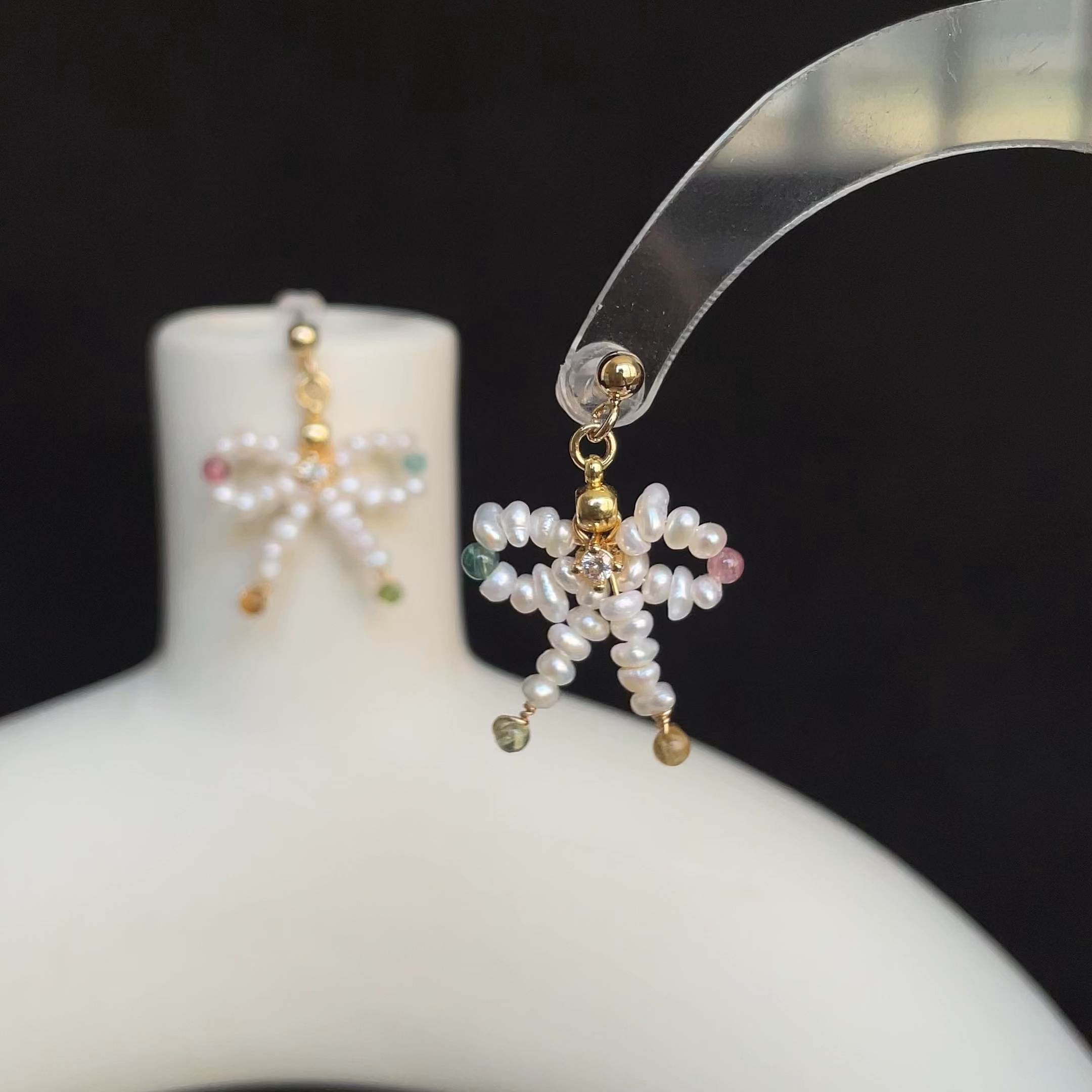 Handmade Dainty Freshwater Pearls and Pastel Tourmaline Bow Earrings Cute Earrings