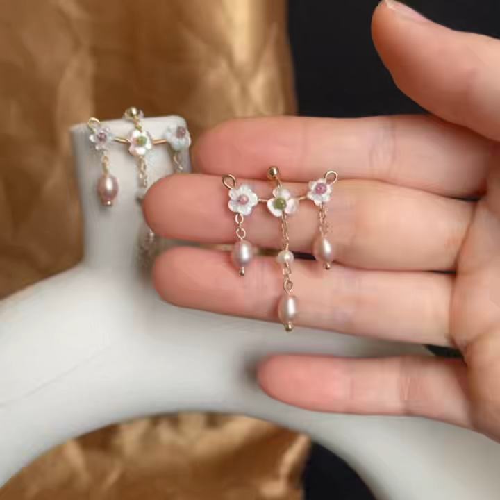 Handmade Ear Cuff Floral Earrings Mother-of-Pearl Blossoms with Tourmaline Centers and Lilac Pearl Tassels