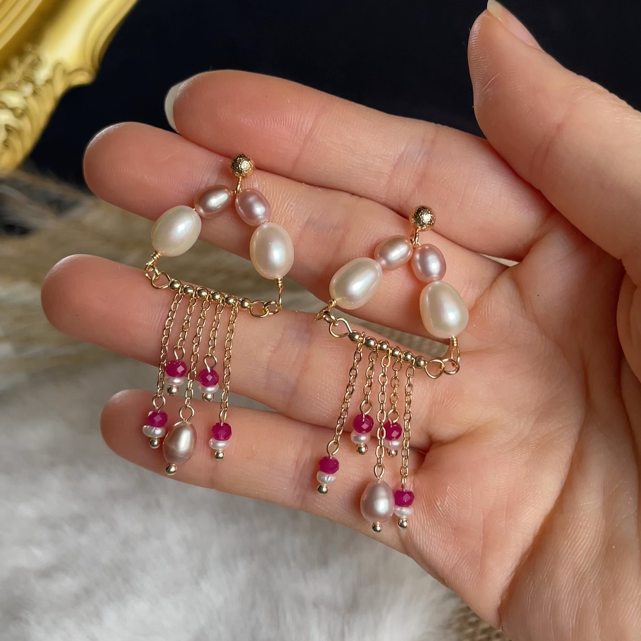 The top features a delicate pairing of white and blush-lavender freshwater pearls, while cascading gold chains shimmer below, finished with tiny ruby faceted beads and petite pearls — like sparkling drops of sea light.