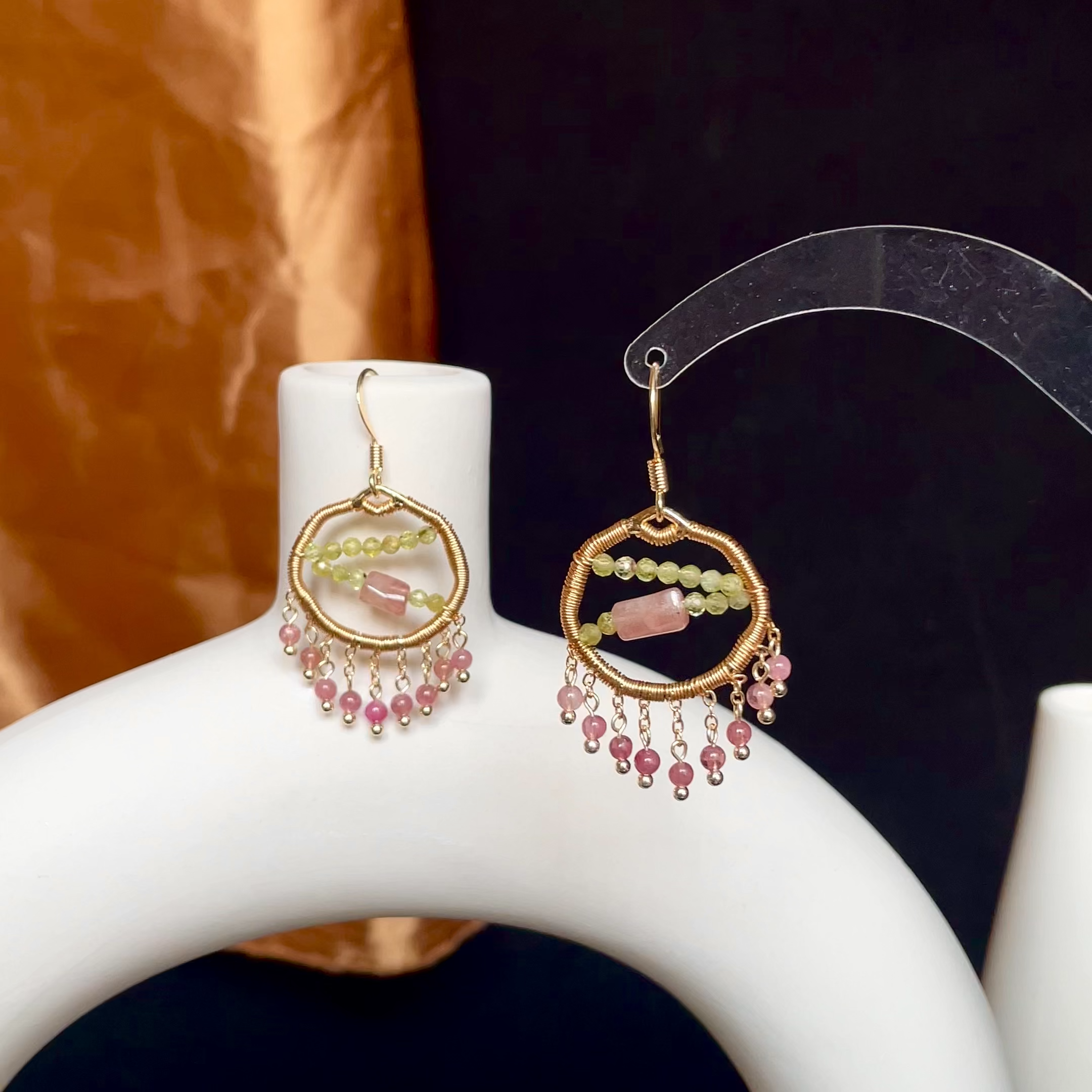 Handcrafted with faceted peridot beads, these earrings form a soft, flowing line reminiscent of tender spring branches. At the center rests a natural pink tourmaline crystal, wrapped delicately in gold-toned wire — raw, imperfect, and alive.
