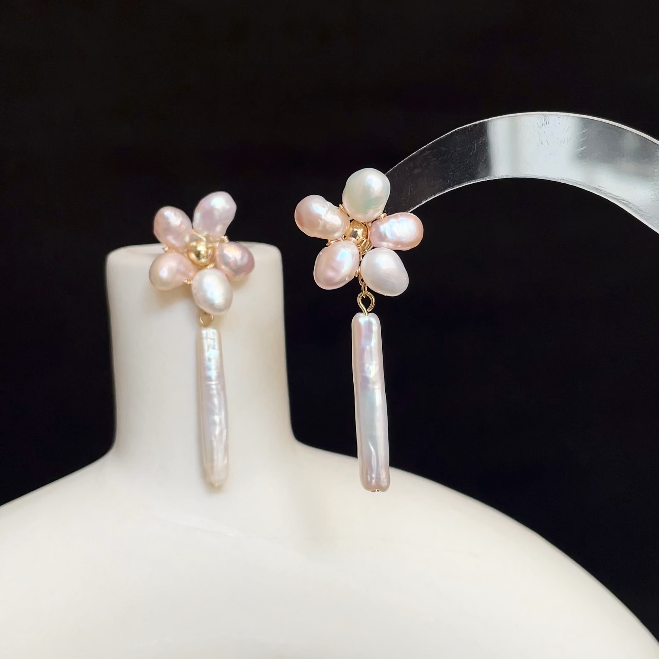 Unlike mass-produced pearl jewelry, these blossoms feature irregular white and lavender pearls, making every petal slightly different—just like real flowers. The elongated baroque pearl drops add a rare, organic elegance that you won’t find in ordinary pearl earrings.