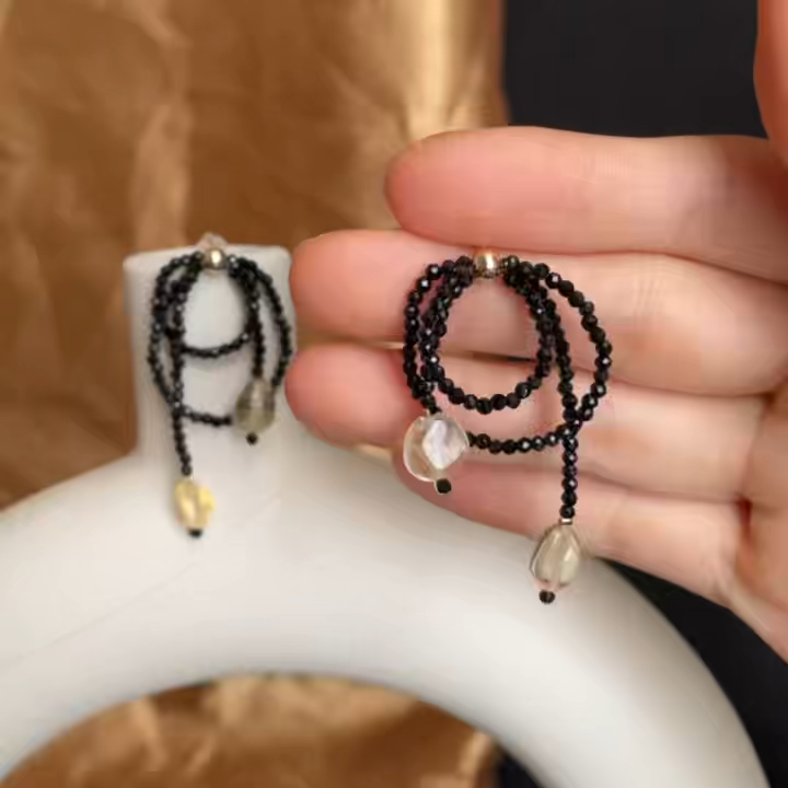 These handcrafted earrings feature micro-faceted black spinel beads wrapped into layered hoops, finished with warm citrine nugget drops that glow like captured sunlight.