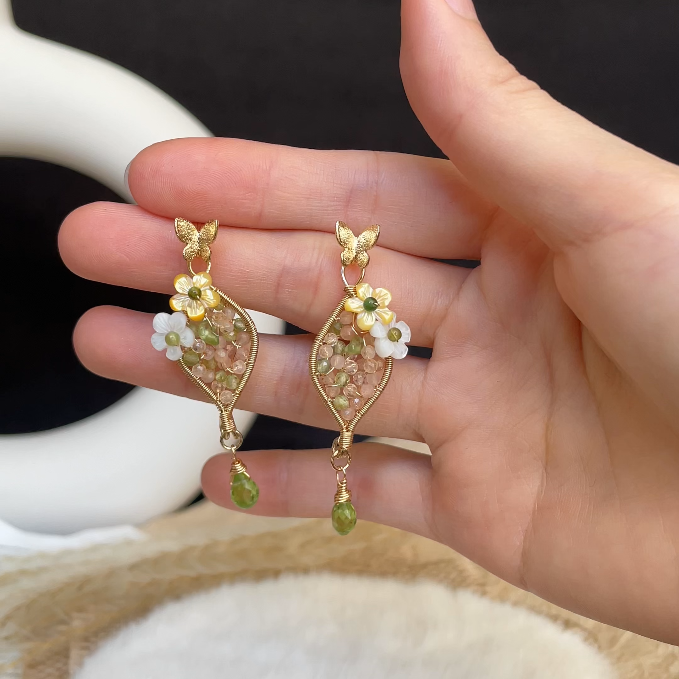 • Flowers: Hand-carved shell flowers in white & yellow, accented with green tourmaline centers