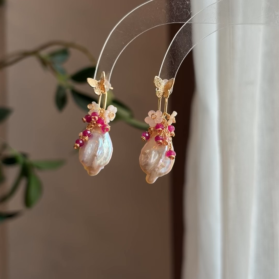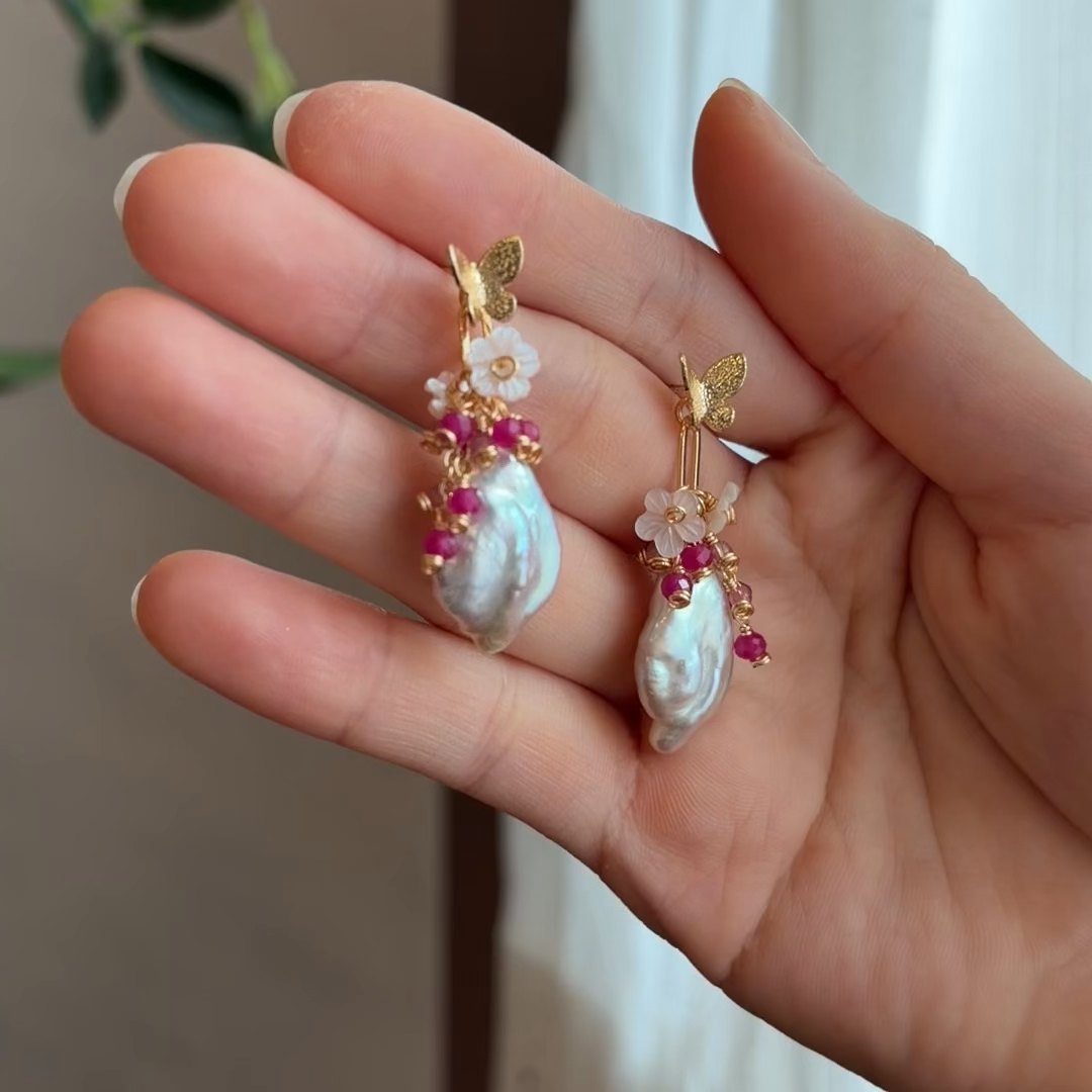 These handcrafted earrings feature luminous baroque pearls, paired with delicate ruby and pink tourmaline accents, and finished with tiny carved shell flowers.