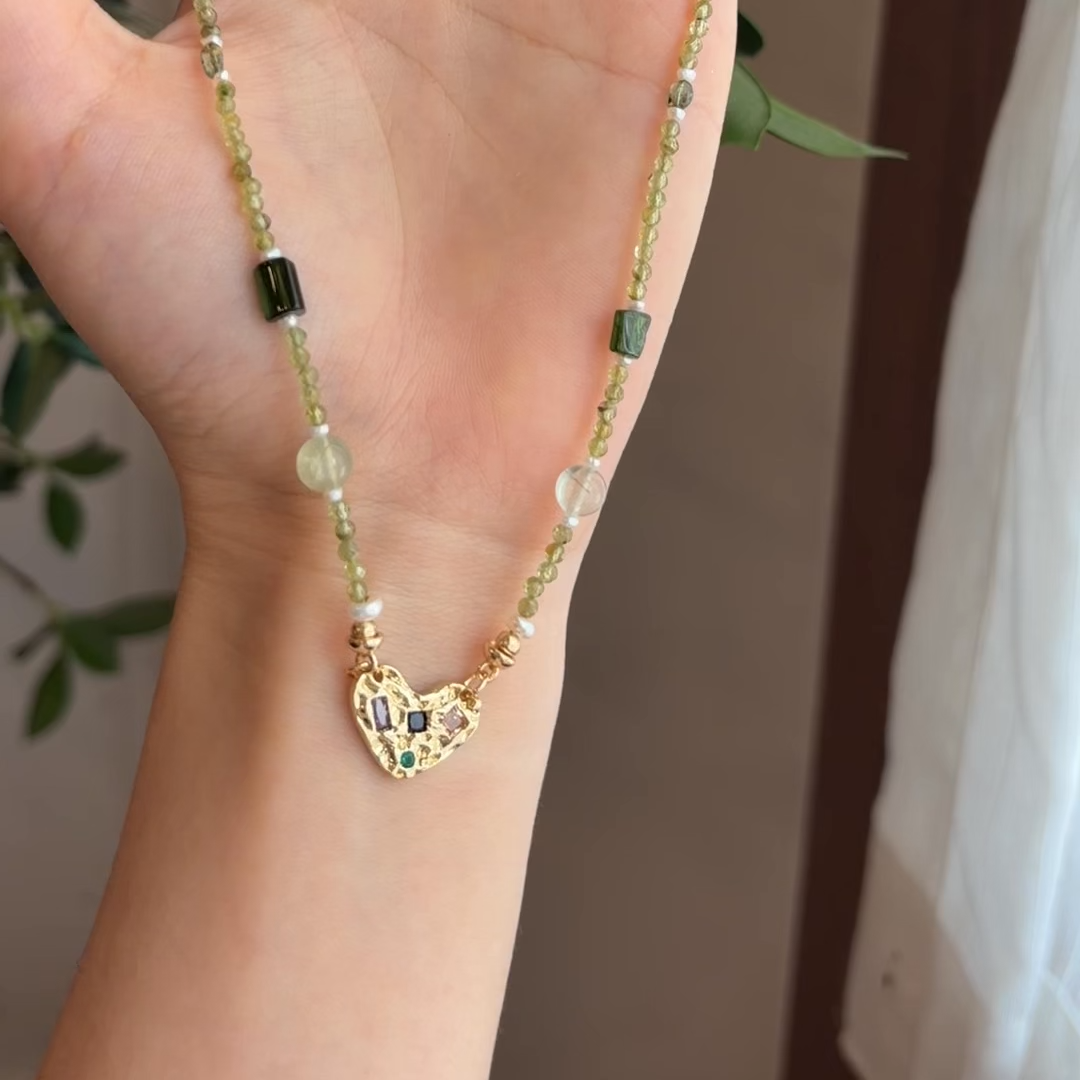 Handmade Green Gemstone Necklace with Zirconia Inlaid Heart Pendant Handmade Green Gemstone Necklace with Zirconia Inlaid Heart Pendant