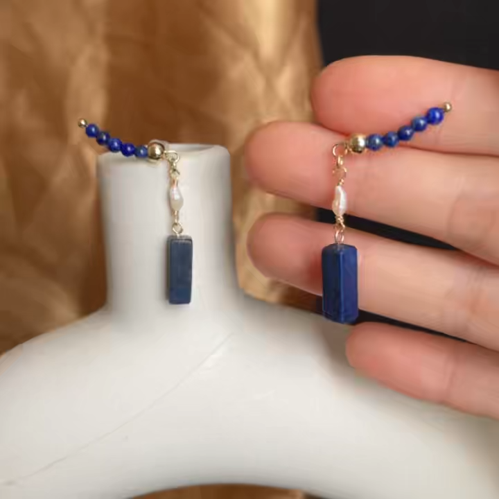 A curved line of round lapis lazuli beads elegantly climbs along the earlobe, while a rectangular lapis bar and a natural Keshi pearl dangle gracefully below — blending geometry and fluidity in one delicate design.