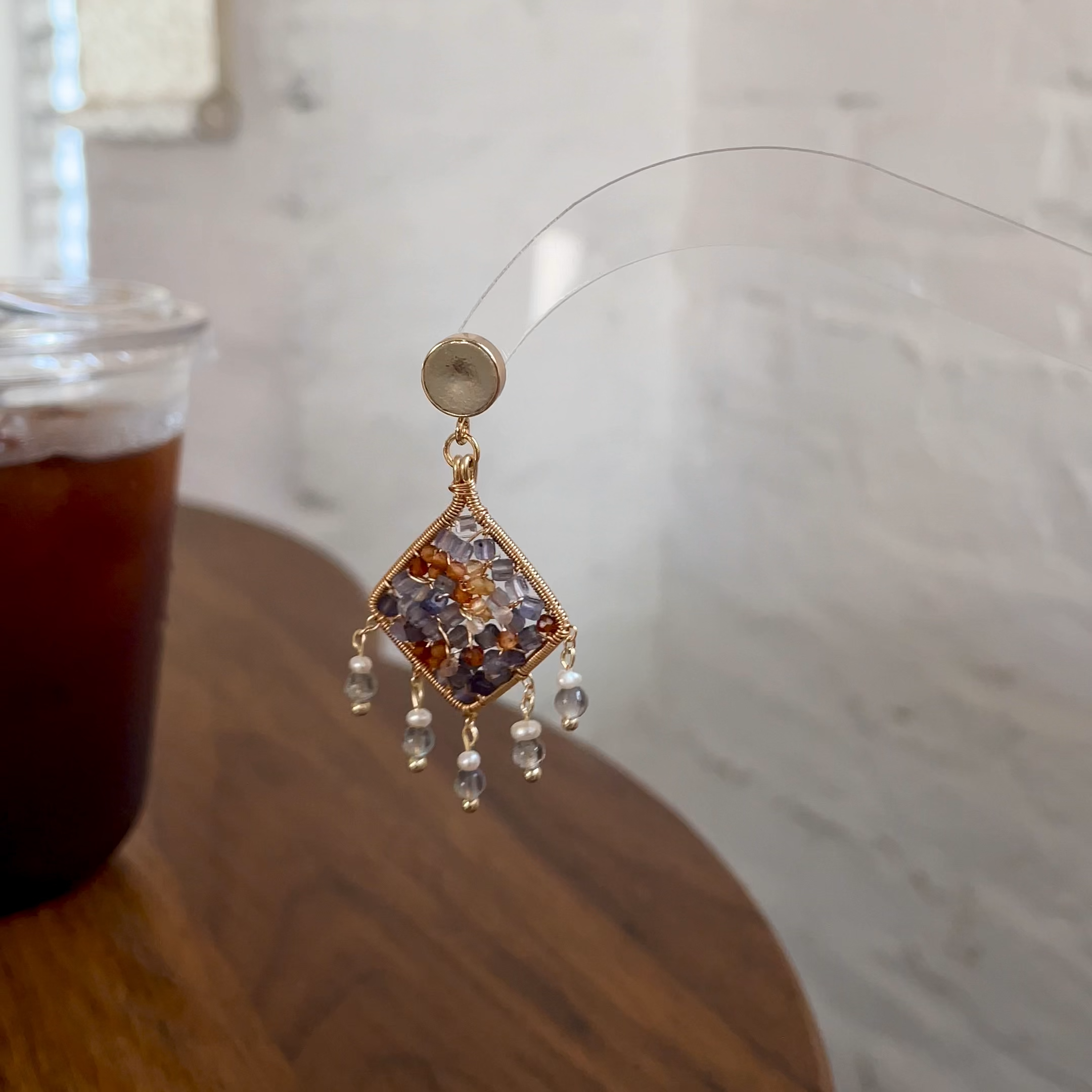 Sunset at Sayram Lake Handmade Iolite and Hessonite Garnet Wire Wrapped Earrings with Labradorite and Pearl Tassels