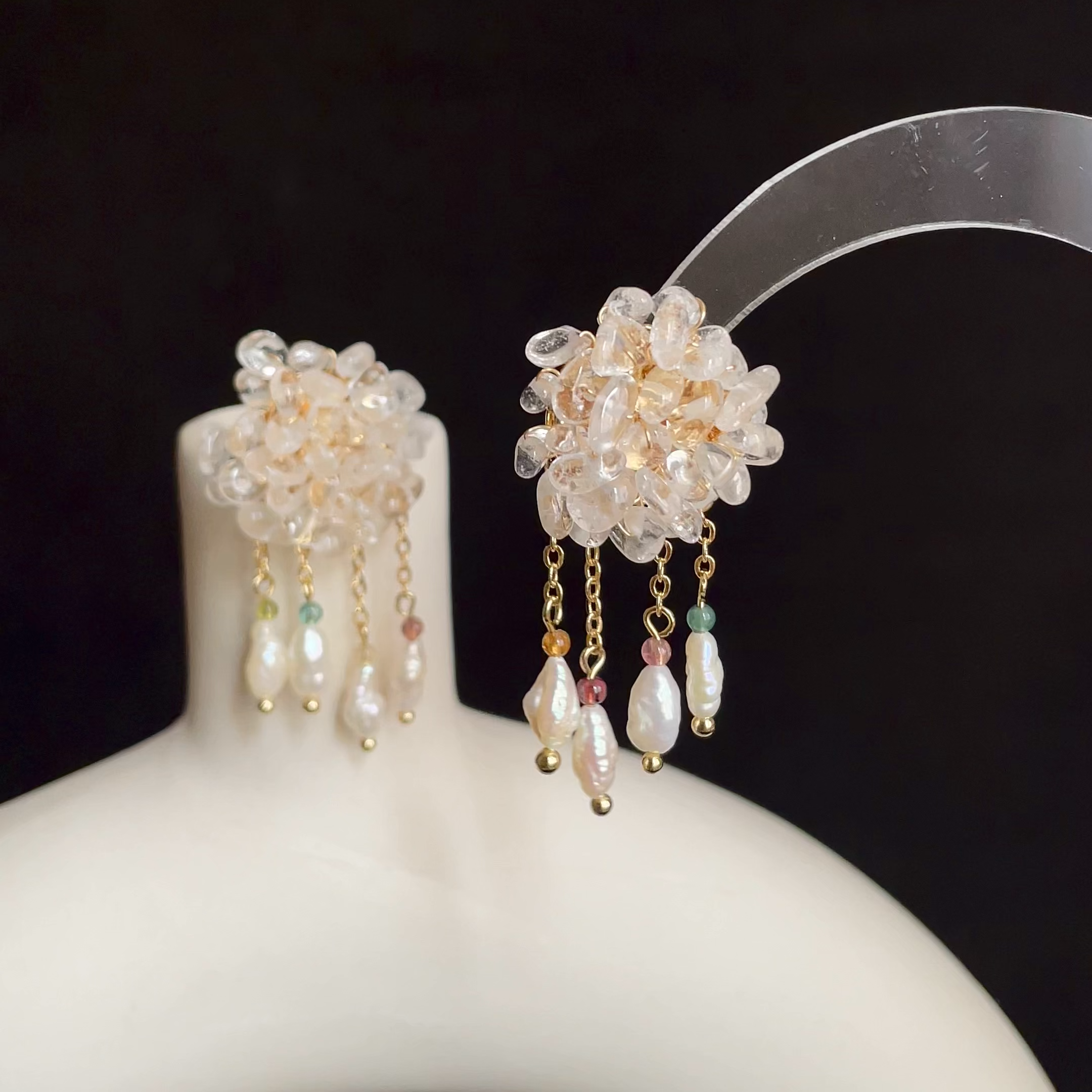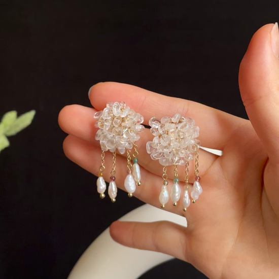 Inspired by gentle rain falling through a pale morning mist 🌫️, these ethereal earrings are woven from sparkling clear quartz chips and adorned with delicate dangling strands of Keshi pearls 🤍 and natural tourmaline beads 🌈.