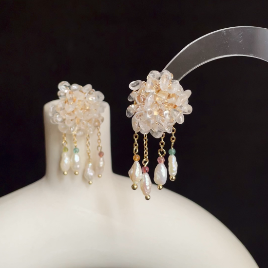 Each earring features a hand-woven round disc of clear quartz ✨, reminiscent of a dewdrop caught in a spiderweb. From the center, soft pearl droplets cascade like rain, tipped with shimmering rainbow tourmaline stones that glow in subtle earthy hues 🌿🌸.