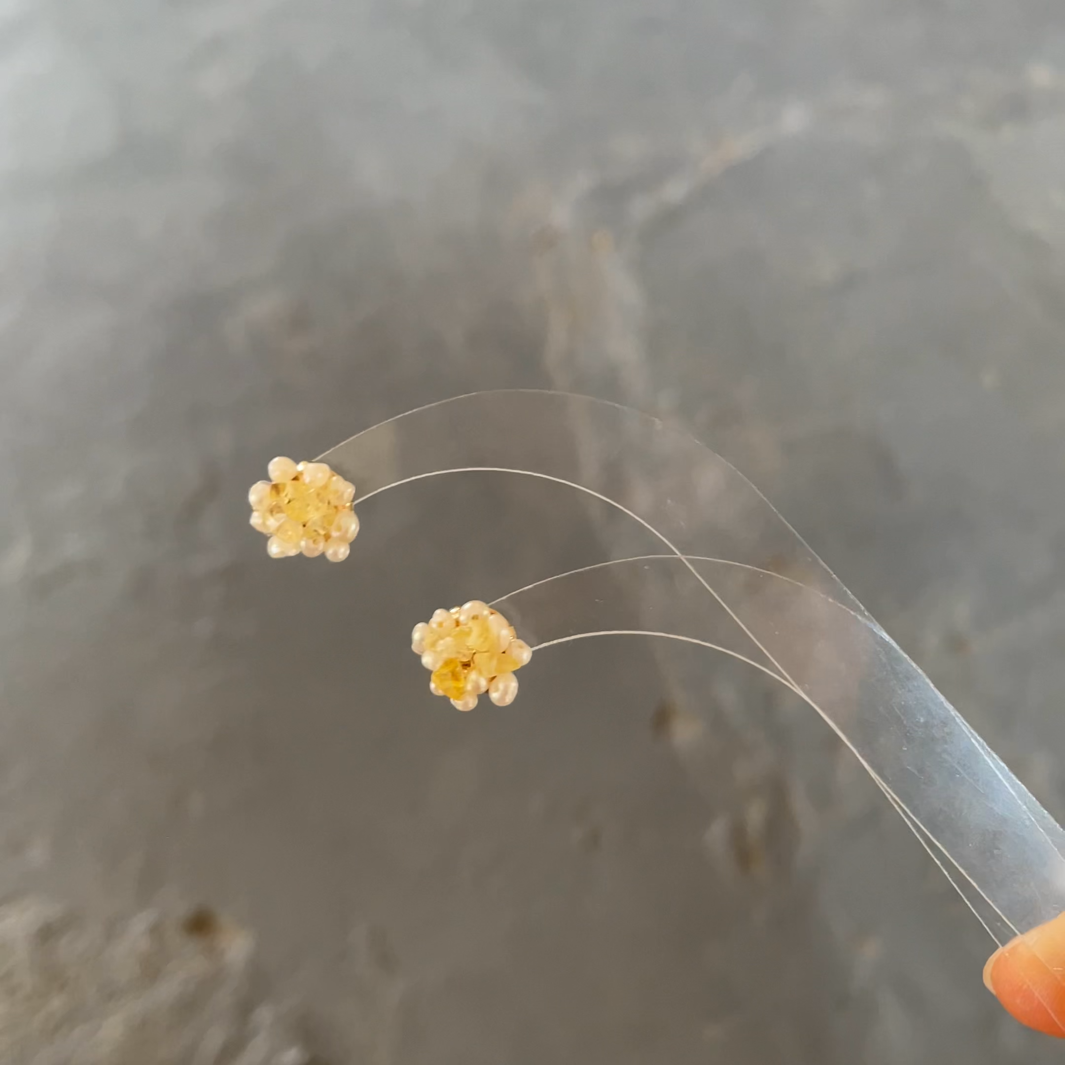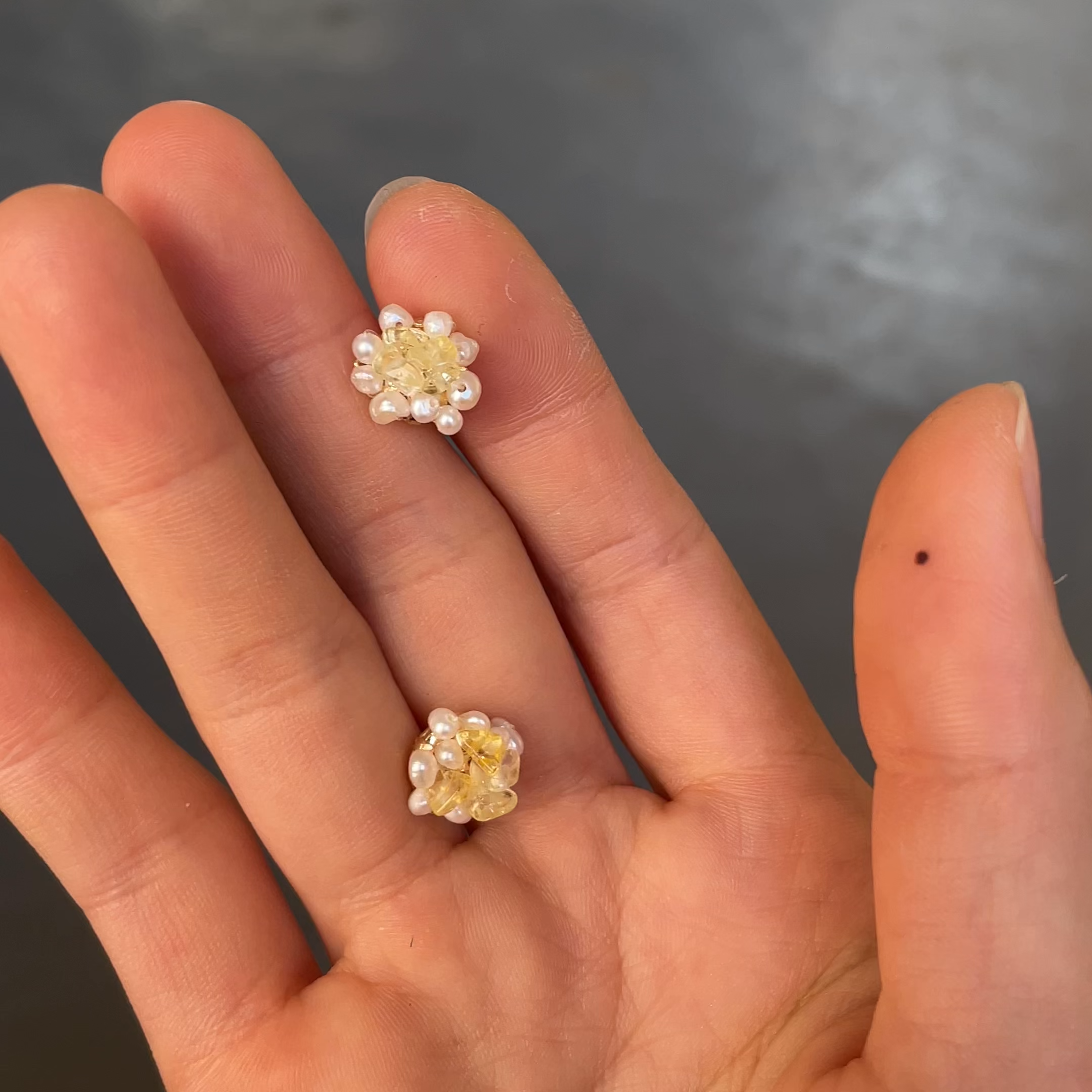 These delicate stud earrings are handcrafted using natural citrine crystal chips and mini freshwater pearls, carefully woven into a soft, flower-like cluster.