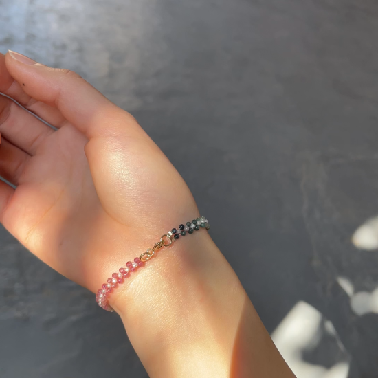 This delicate bracelet is handcrafted with tiny multi-color tourmaline beads and petite freshwater pearls, carefully woven into a soft, flowing gradient.