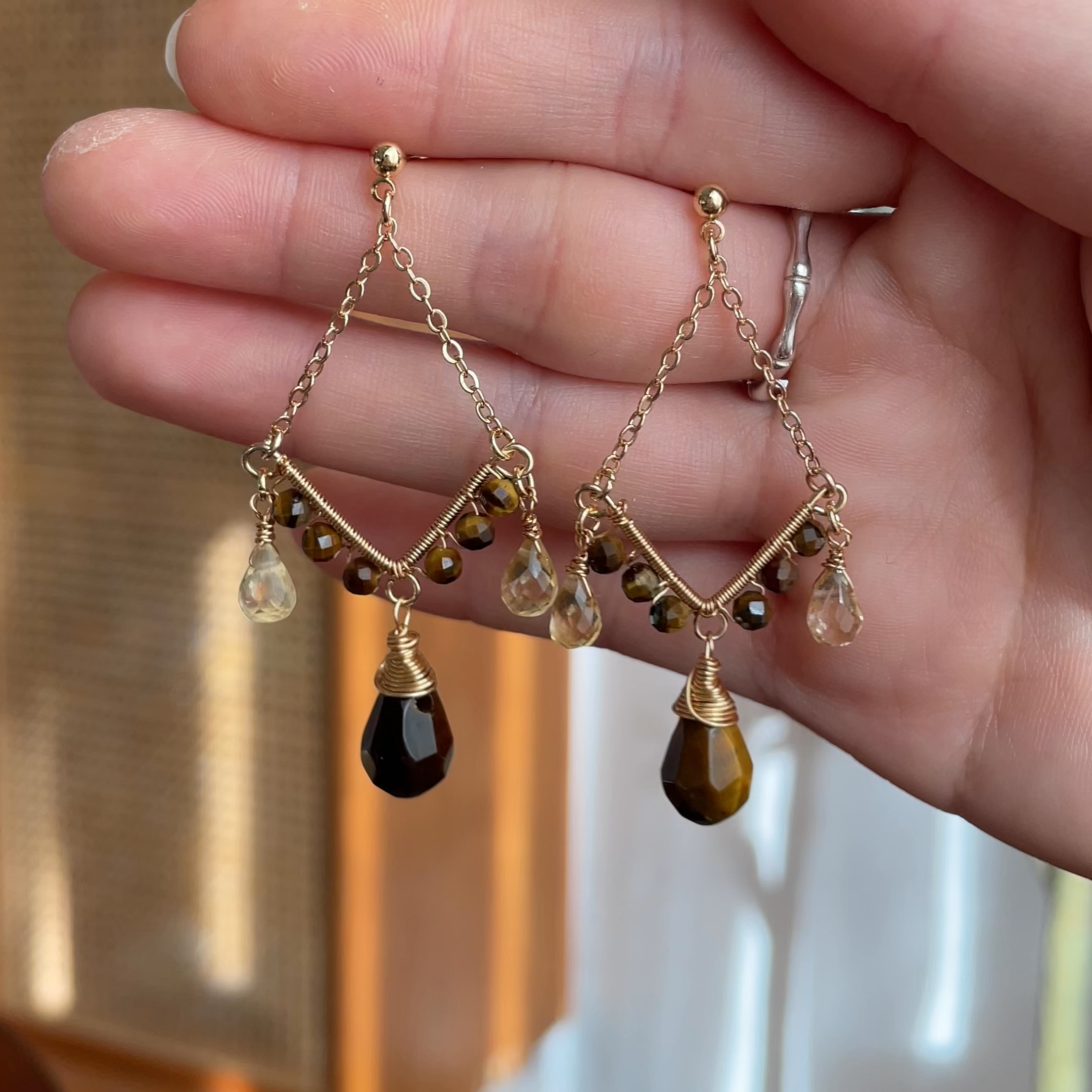 At the center hangs a faceted tiger’s eye teardrop, hand wire-wrapped to reveal its natural chatoyancy — a soft, shifting glow reminiscent of light moving through stone. Above, a delicate V-shaped wire frame is adorned with faceted tiger’s eye beads, flanked by faceted citrine teardrops that catch the light with subtle brilliance.