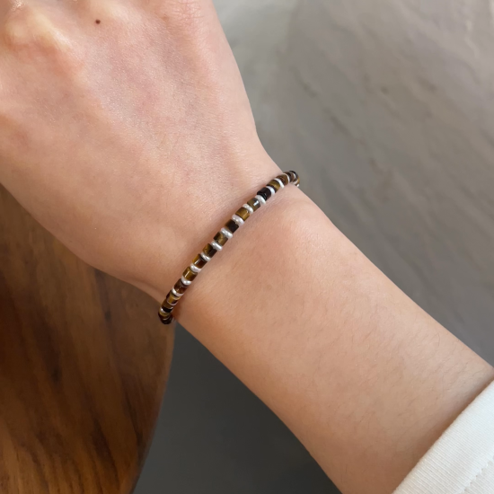 This handcrafted bracelet features column-cut Tiger’s Eye beads paired with delicate freshwater pearl spacer beads, creating a refined rhythm of strength and softness.
