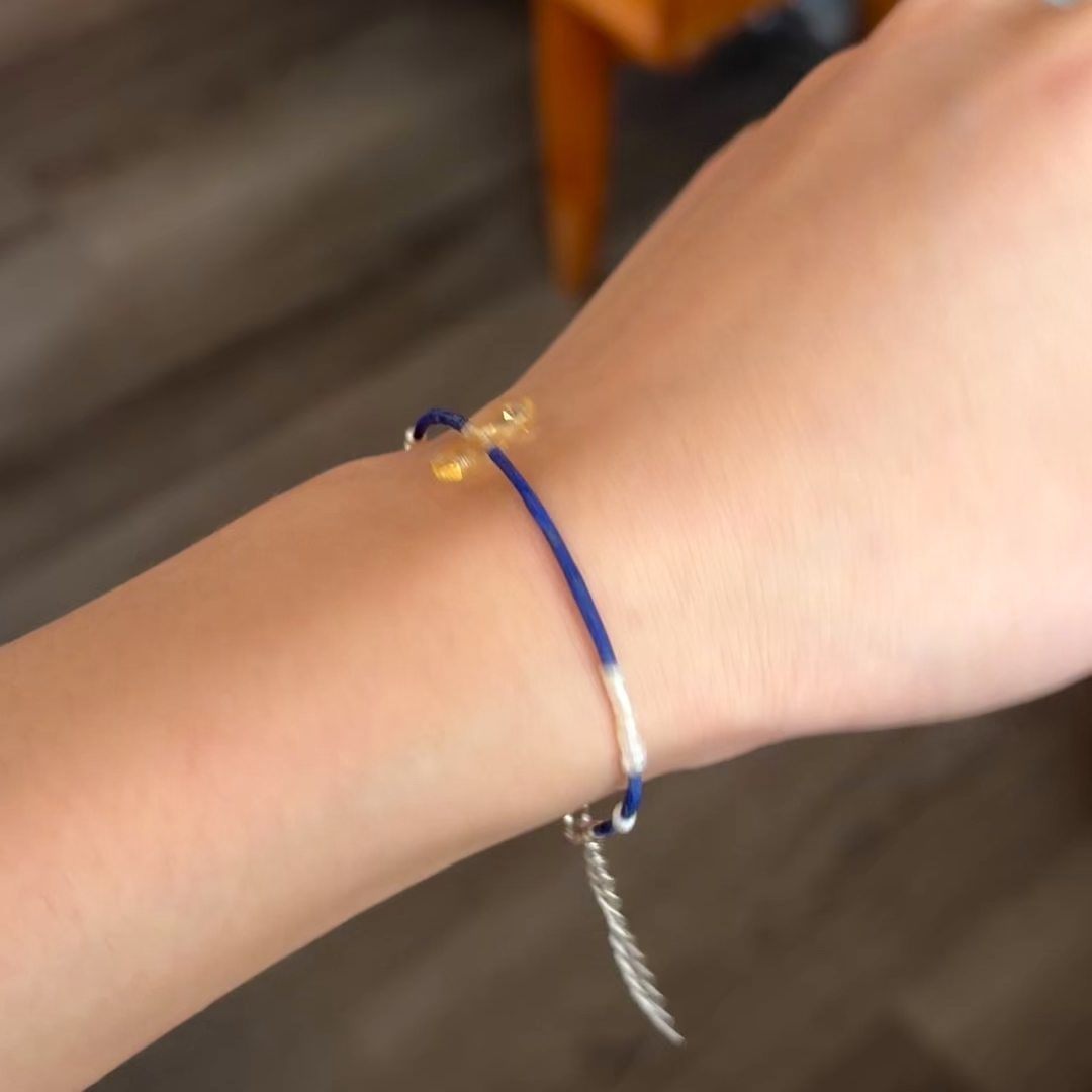 This handcrafted bracelet combines deep blue lapis lazuli beads with a warm, glowing citrine drop, accented by tiny freshwater pearls and sterling silver details.